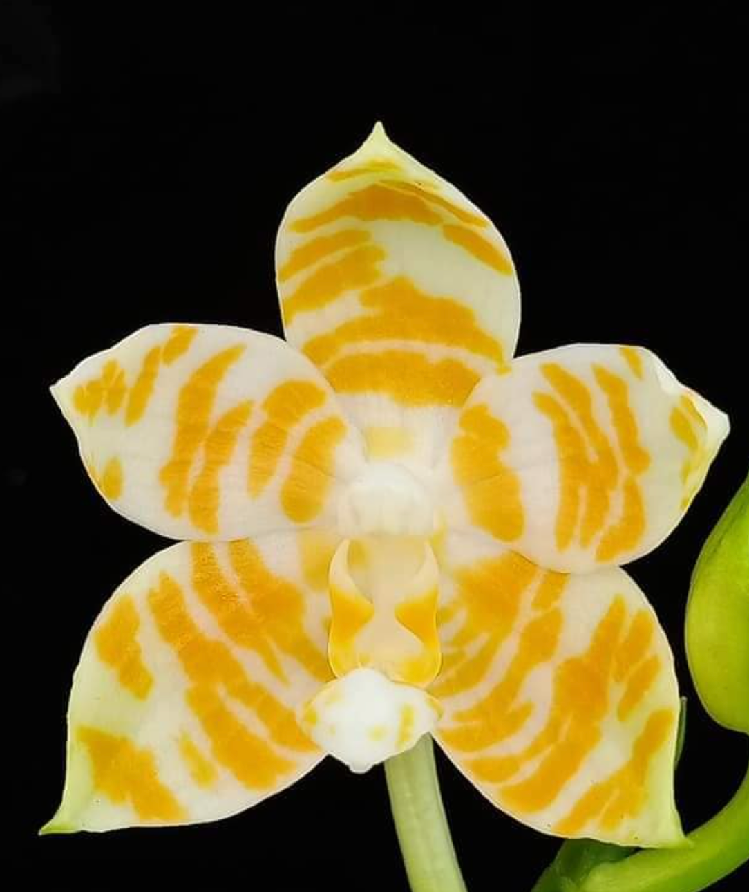 Phalaenopsis KS Super Zebra ‘Golden Zebra’ is a stunning hybrid moth orchid known for its bold golden-yellow petals adorned with dramatic horizontal zebra-like stripes in deep maroon or burgundy. Each bloom is a vivid display of contrast and structure, combining elegance and exotic charm.